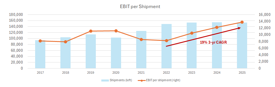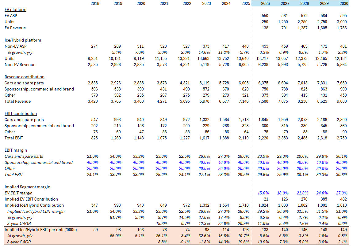 For a business that compounded revenue and EBIT per shipment at 7% and 11% annually between 2018 and 2025, the 2030 guidance implies that the core ICE/hybrid revenue and EBIT per shipment compound at roughly 2% and 3% respectively over the next five years. The guidance is effectively saying the core run-rate business, before any EV contribution, barely grows on a per-unit basis and basically flat on an aggregate basis.
