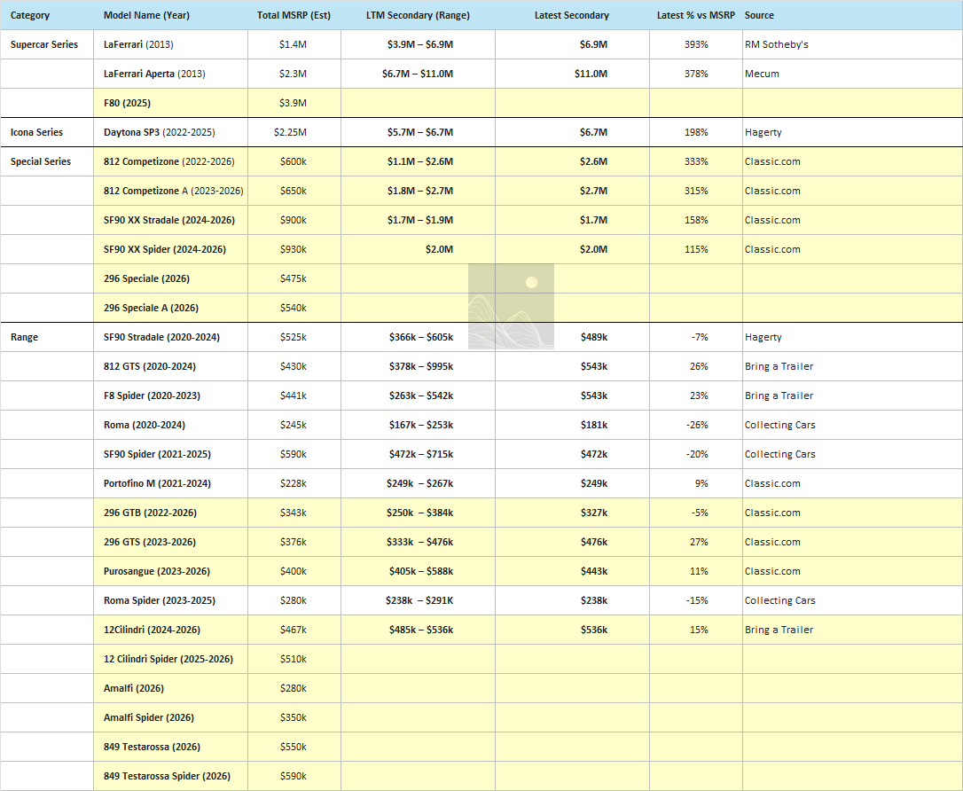 Ferrari is a Veblen good. These should be assets that appreciate. But looking line-by-line at the last five years of Range launches and comparing current secondary market values to list, they have been hit or miss.