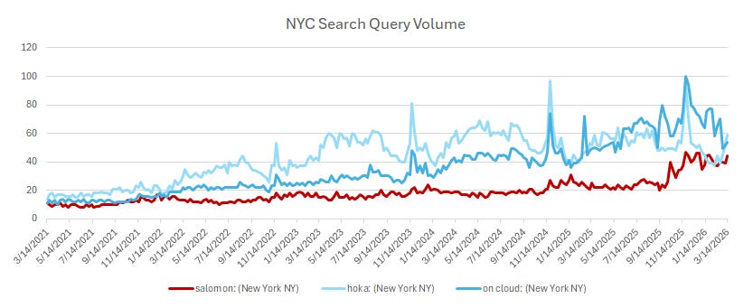 While the brand itself had been quietly establishing itself state-side, when we look at the U.S. search trends as whole, Salomon is still 25 percent of Hoka and On’s levels. But the market here is still so nascent, that it’s more appropriate to look at key landing zones like NYC to get leading indicator of demand. In the case of NYC, we’re looking at Salomon nearing parity with the leading disruptive footwear brands.