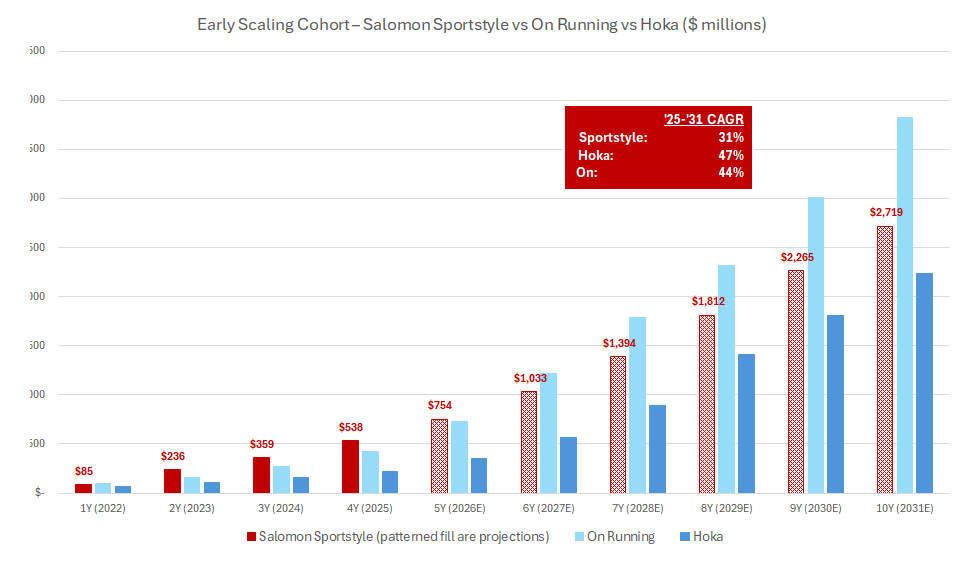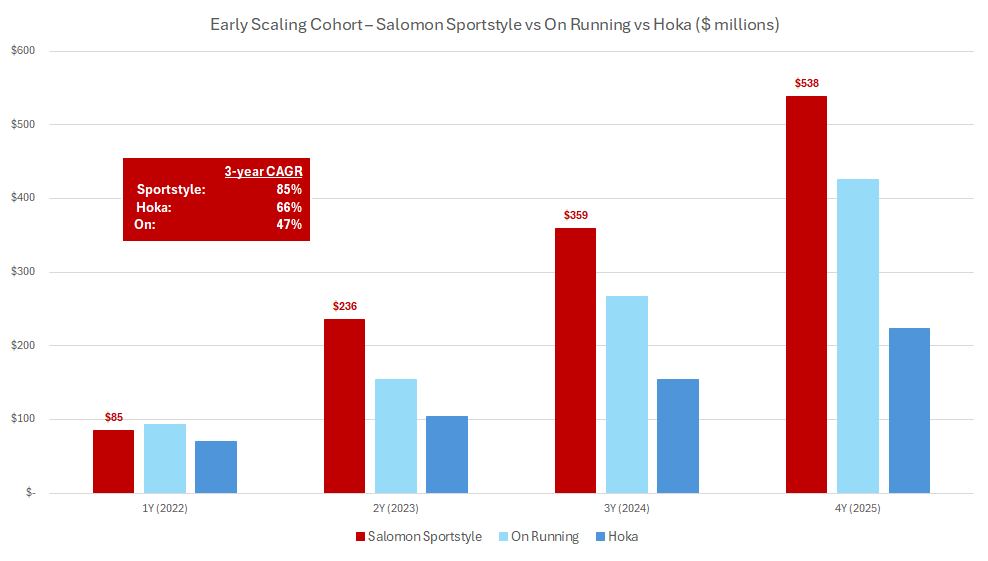 The chart below helps visualize the point. When we line up the early scaling of Sportstyle against Hoka and On, starting from a similar ~$80 million base, Salomon’s ramp stands out: Salomon’s Sportstyle is tracking ahead of both Hoka and On at a comparable point in their development.