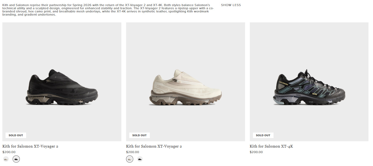 It also appears that the strategy to elevate the brand from a fashion perspective remains intact. We see the Spring 2026 collection Salomon launched in partnership with Kith below, and it appears the collection is already sold out.