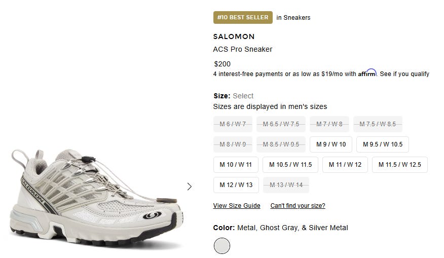 From a product perspective, we can see that Salomon and its newer products are showing up well in the marketplace. Salomon’s newly relaunched ACS Pro, is the #10 best selling sneaker on FWRD, and it’s the only $200 sneaker in the top 25. The ACS Pro is another example of the Sportstyle business extending beyond the XT-6 franchise.