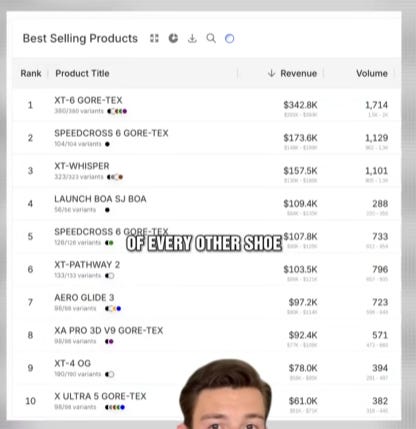 And beyond the XT-6 hero product, Sportstyle has been doing a credible job in diversifying into new models, which substantiates the XT platform as a legitimate growth vehicle going forward. Below we see a screenshot and TikTok video from Particl, an e-commerce competitive tracking tool, showing that the newer XT-Whisper holds its own as a top-3 best selling Salomon footwear product along with the XT-Pathway 2 and XT-4 OG contributing solidly as well.