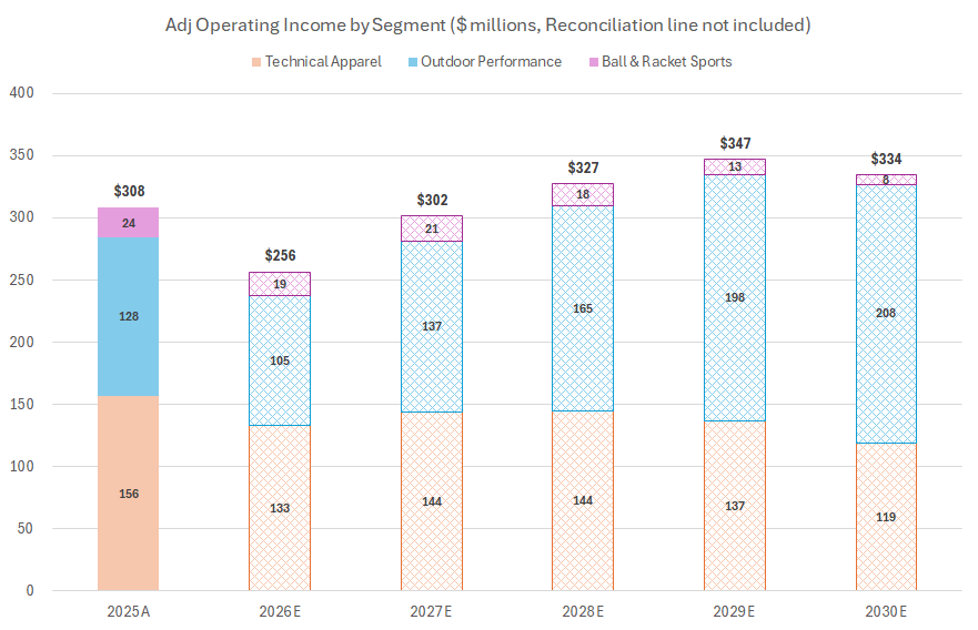 So, what can this mean from a profitability perspective? A couple charts provided below sketch the potential opportunity at the operating income level. While I’ve provided precise numbers, this is mainly a directional exercise, and the findings are that Salomon becomes the primary profit driver of the business within a few years, provided that the footwear business expands in a manner consistent with the growth profile of its peers (I know, it’s a big if).