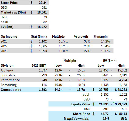 Currently, the asset is worth 16.5x ‘26 EBIT or ~11x ‘28 EBIT, based on my estimates, which are generally 20-25 percent higher than street. I think there’s a distinct possibility that the ‘28 EBIT multiple can graduate closer to 14x, as this level would put it closer on par with a quality growth asset like On. From a recommendation standpoint, while the table below shows a range of upside from 32 to 56 percent from current levels, as we’ve seen how 2026 has progressed, it’d be wise to layer in a healthier dose of conservatism into these numbers. As such, we’re probably closer to 30 to 40 percent of upside in the next 12 months, which is good, but I’m sure there are better ideas out there. This is probably a starter-to-lower sized position at this point. That said, if there’s further evidence of Sportstyle progress or if the core Performance footwear business starts seeing success in its GRVL/run franchise, the upside calculus can probably go north from where I’ve laid it out below.