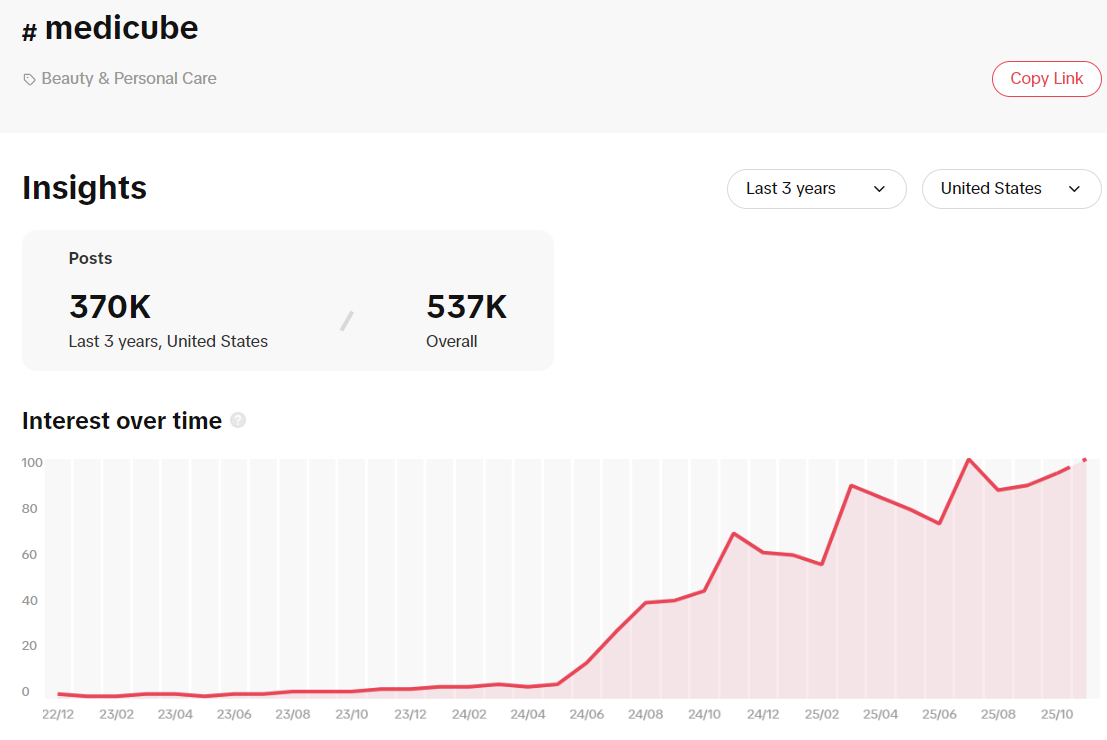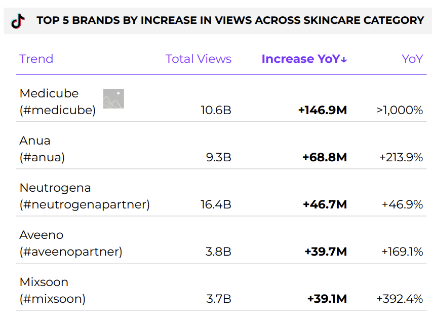 In fact, Medicube has quickly become one of the biggest beauty brands represented on all of TikTok, with total views that have 10x’d in the last 12 months. (source: Spate)