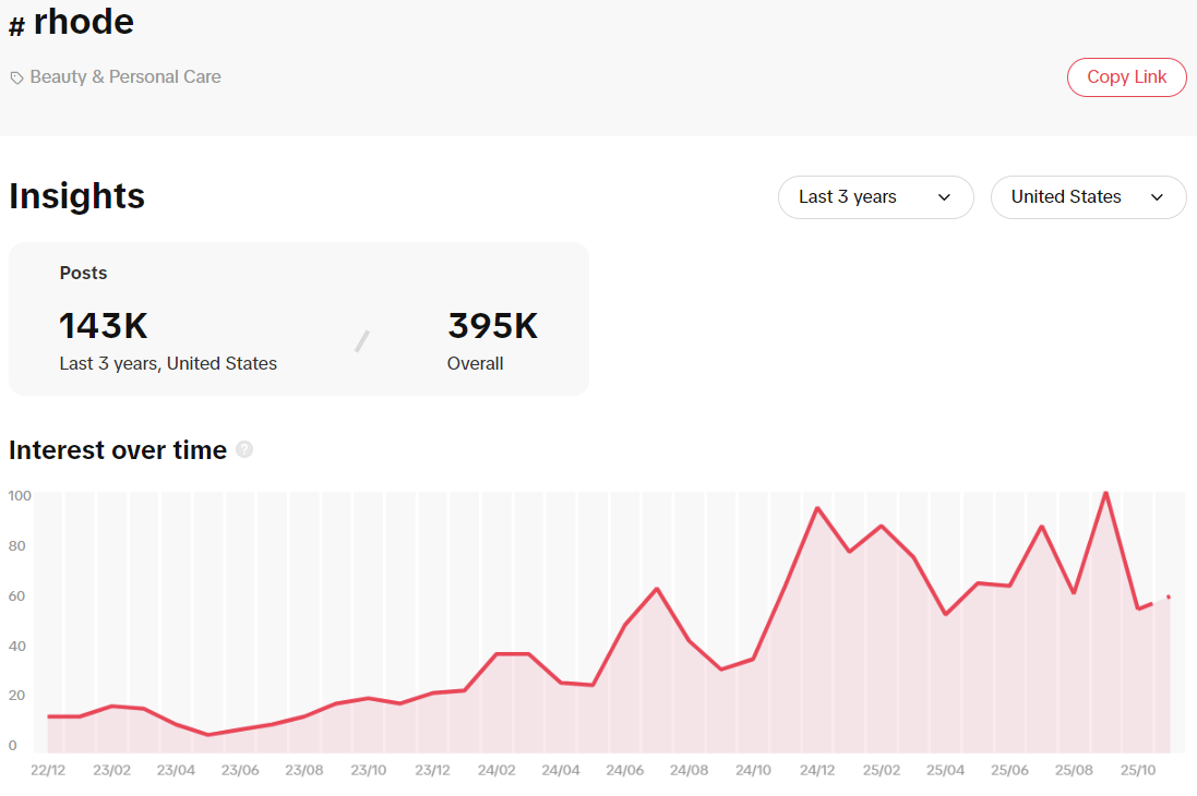 And comparing Medicube to comparables brands’ mentions on TikTok (see snapshots below) is a legitimate demonstration that the brand is a sleeping juggernaut. It is either an order of magnitude greater or meaningfully more present in consumers’ mindsets than Sol de Janeiro, Rare Beauty, La Roche Posay, and Rhode, which is an impressive list of peers/competitors.