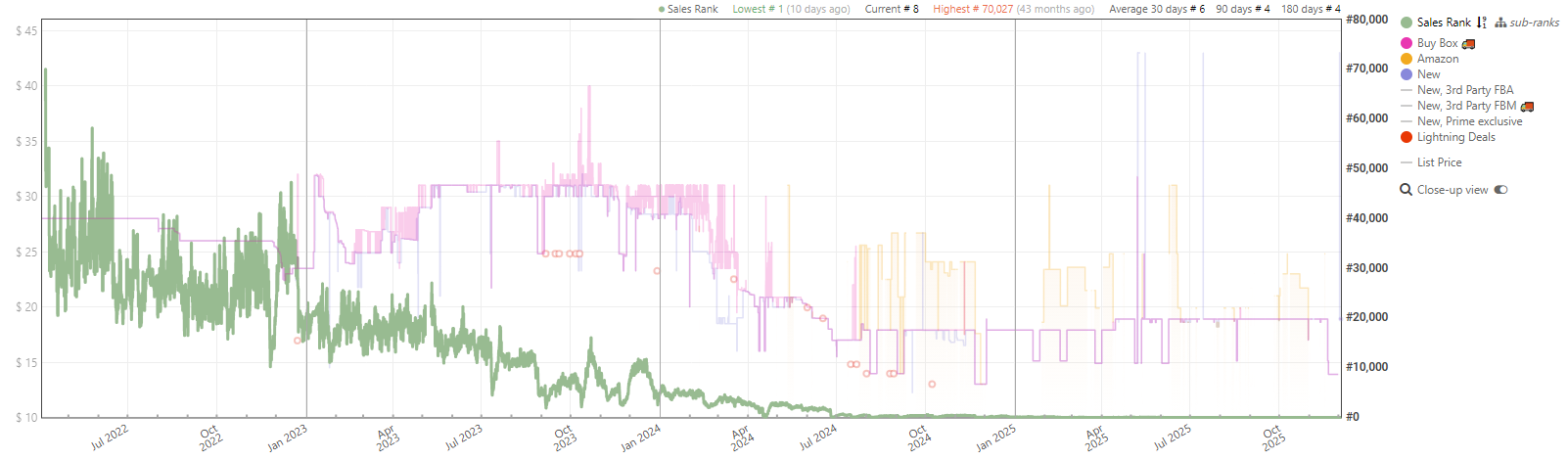 This review depth is comparable to the early years of The Ordinary or Cerave’s breakout. And across its product portfolio, APR Co has slowly chipped away at cracking the Amazon algorithm to consistently gain share and climb the bestselling rankings. Since mid-2024, the Zero Pore Pad product has been a top 10 bestselling product (like golf, the lower the green line value the better) across Amazon’s entire Beauty & Personal Care category: