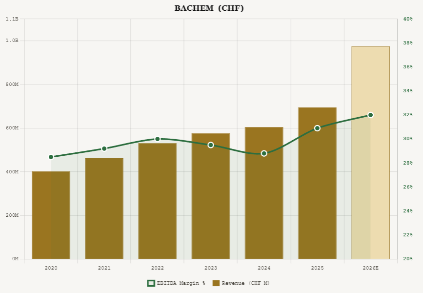 Bachem at an EV of approximately CHF 5 billion against CHF 215 million of 2025 EBITDA trades at roughly 23x trailing equity value to EBITDA. On 2026 guidance, the multiple compresses to approximately 16x forward, which is cheaper relative to Lonza and Samsung Biologics given that Bachem is guiding for 35 to 45 percent revenue growth while those peers are growing 10 to 20 percent.