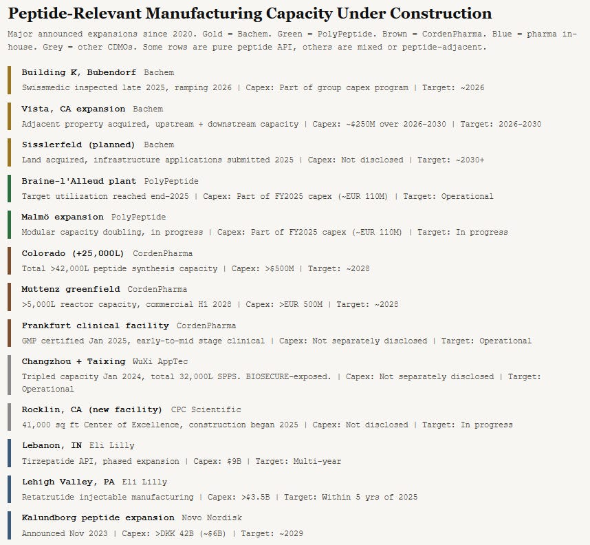 Capital intensity sets the floor. Bachem reported CHF 333 million of capex in 2025 and plans more than CHF 400 million in 2026. Building K has been under construction since 2021. PolyPeptide reported EUR 110 million in 2025 capex. CordenPharma is investing more than €1 billion over three years.