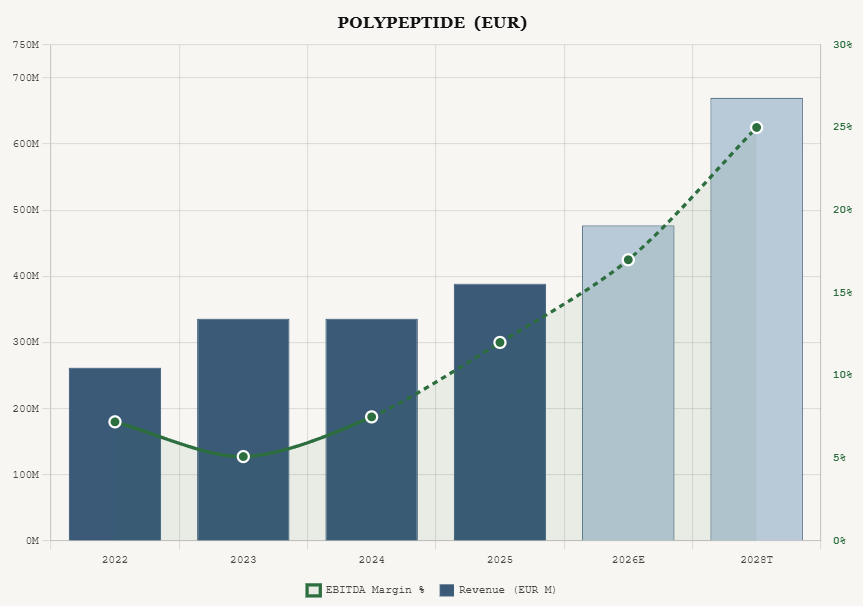 PolyPeptide at an EV of approximately CHF 1.14 billion (EUR 1.24 billion) against EUR 47 million of 2025 EBITDA trades at roughly 26x trailing, but this is misleading because the margin is at trough levels (12% versus a 25% midterm target). On 2028 targets, the stock trades at approximately 7.4x forward EV to EBITDA. Even with a meaningful discount for execution risk, the valuation compression from trailing to forward multiples is significant, and the underlying business is growing 20 percent annually on demand that management attributes specifically to metabolic therapeutics.